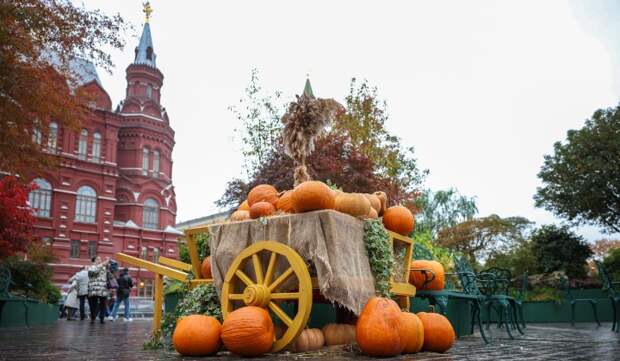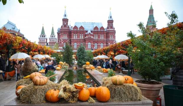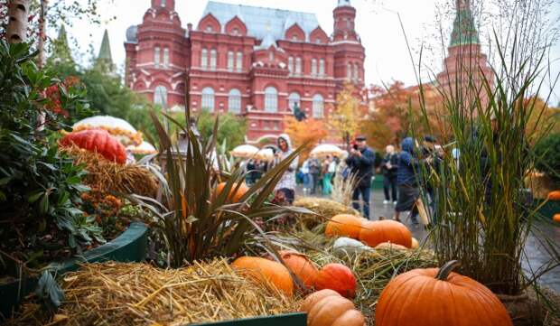 Площадку оформили в теплых оттенках рыжего, красного и желтого. Повсюду расставили снопы сена и более тысячи тыкв — от миниатюрных до гигантских.