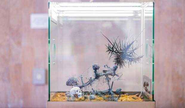 Также на выставке разместились 16 террариумов, в которых экзотические животные соседствуют с арт-объектами. Так, в одном из них жуки-трилобиты обжили космический корабль, а в другом — индийский тигровый птицеед плетет свою паутину вокруг пластиковой скульптуры.
